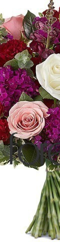 4 x Pink Roses, 4 x White Roses, Red Spray Carnations, Purple Bouvardia, Eucalyptus